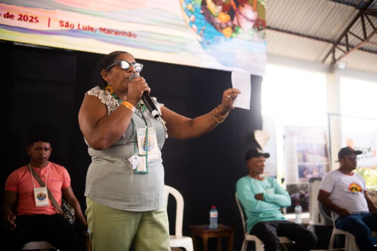 Marli Borges, liderança quilombola, abriu os trabalhos da mesa partilhando sobre as batalhas que a Comunidade Guerreiro (Parnarama/MA) trava há décadas pelo direito à sua terra ancestral. As famílias do Quilombo foram expulsas de seu território tradicional em 2009 por conta de uma ação judicial de reintegração de posse, mas conseguiram retomar suas terras em 2011, a partir da união e mobilização coletiva da Comunidade. “Um palitinho só é fácil de quebrar, mas quando se unem, fica difícil. Então a comunidade se uniu e fomos retomar nosso território”, destacou.